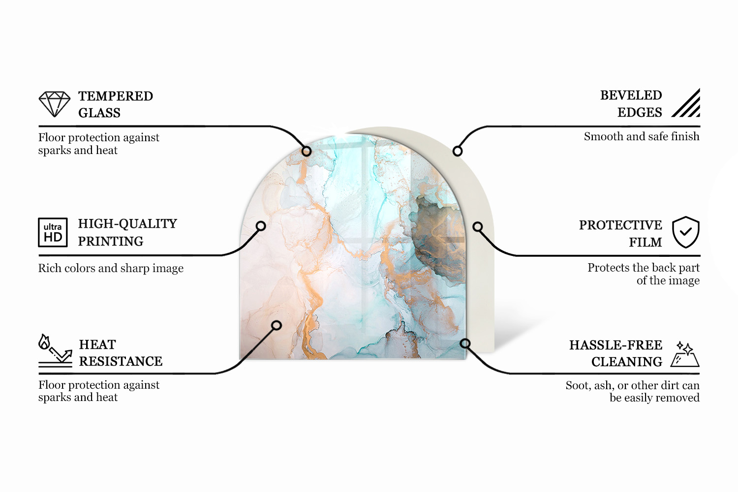 Refresh the style of your living room with the Half-oval tempered glass hearth featuring the unique Damaged wooden board pattern. This elegant glass hearth is proof that floor protection can be beautiful. Thanks to high-quality printing, this product supersedes dull metal sheets and adds a designer touch to your home.