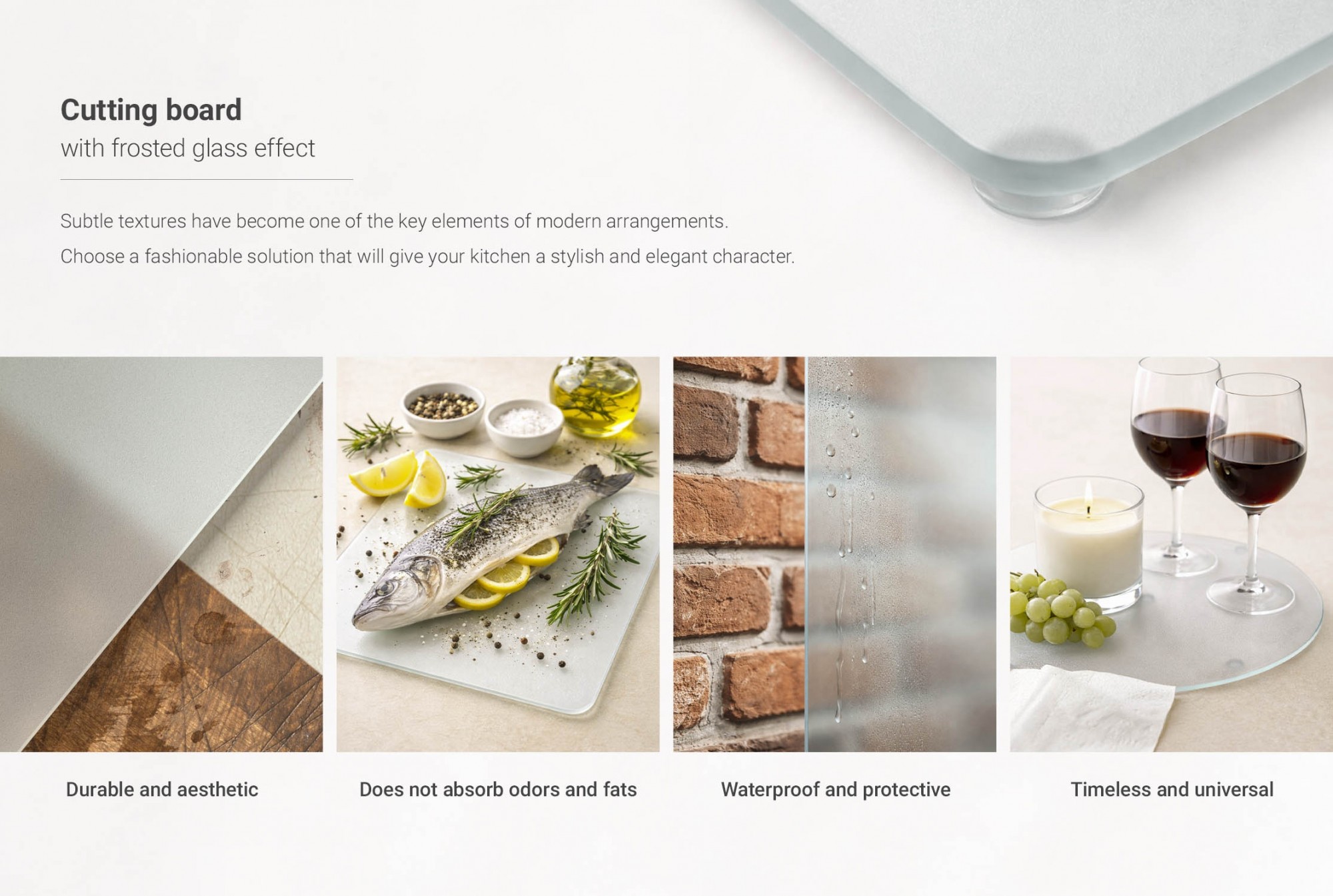 These glass cutting boards work well in contemporary kitchens where clean lines and restrained materials dominate. Their subtle frosted surface complements Scandinavian simplicity and modern minimalism, and can also act as a refined contrast in loft or industrial interiors. Use them on stone, laminate, or wooden countertops as a cutting surface, an elegant trivet for hot cookware, or as serving plates for cheeses and appetizers when hosting. Because the design is understated, the boards integrate seamlessly into breakfast nooks, utility counters, and open-plan kitchen islands without competing with other décor.