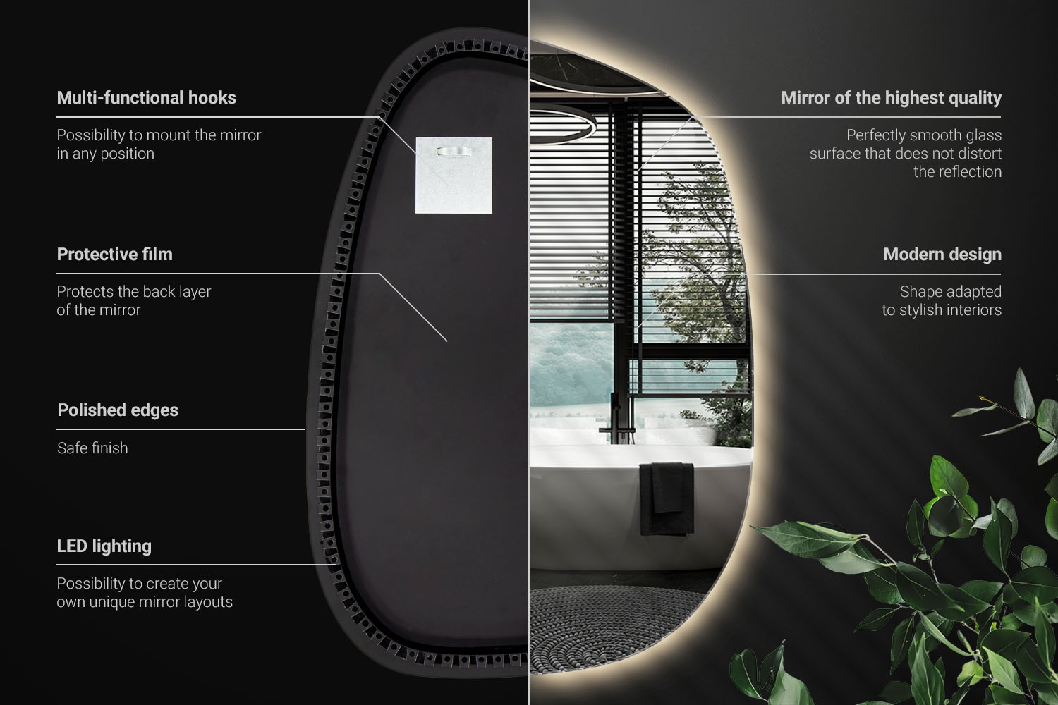 The Organic mirror with led lights 55x38 cm is your new statement piece—an eye-catching blend of creativity and modern design that instantly transforms any room. Its fluid, organic silhouette mimics the natural motion of a water splash, making it feel lively, artistic, and effortlessly stylish. Enhanced with elegant LED lighting, this mirror doesn’t just reflect your space—it elevates it, creating depth, ambience, and a warm glow that enhances both daytime and evening interiors. Whether you're refreshing a bedroom, entryway, or living area, this mirror brings personality and visual impact the moment it’s hung. Available in multiple sizes (49×34 cm, 55×38 cm, 68×47 cm, 79×57 cm, and 91×66 cm), it adapts beautifully to any wall and complements a wide range of décor styles—from minimalist to eclectic.
